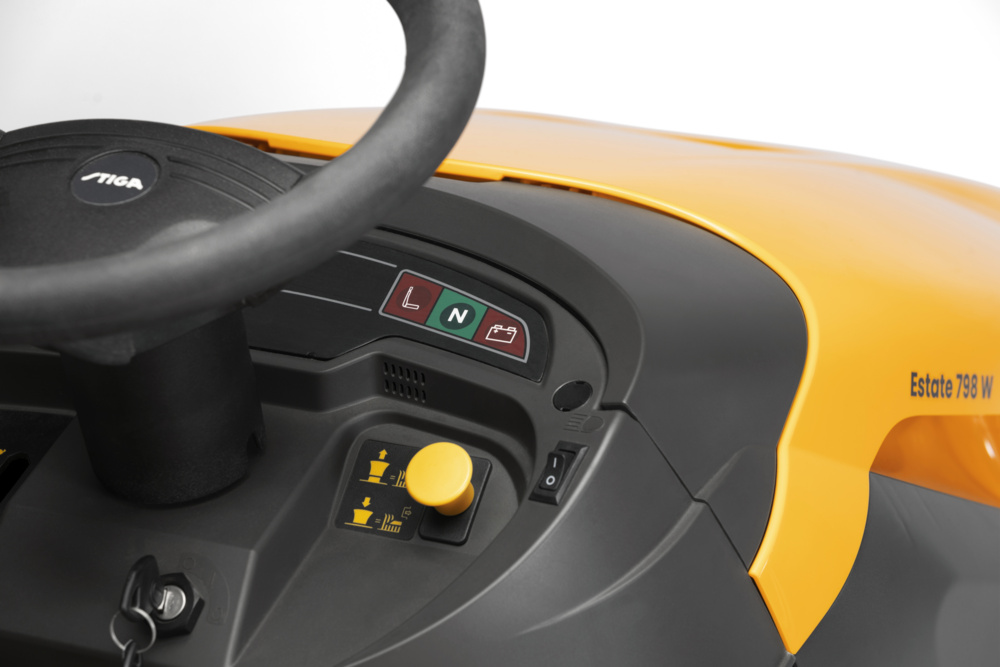 La comodidad del conductor es clave para los jardineros que se enfrentan a sesiones de corte del césped y trabajos de remolque que requieren mucho tiempo, así que STIGA ha equipado el Estate 798 W con un asiento cómodo, un volante Premium de agarre suave y acoplamiento de cuchillas electromagnético.